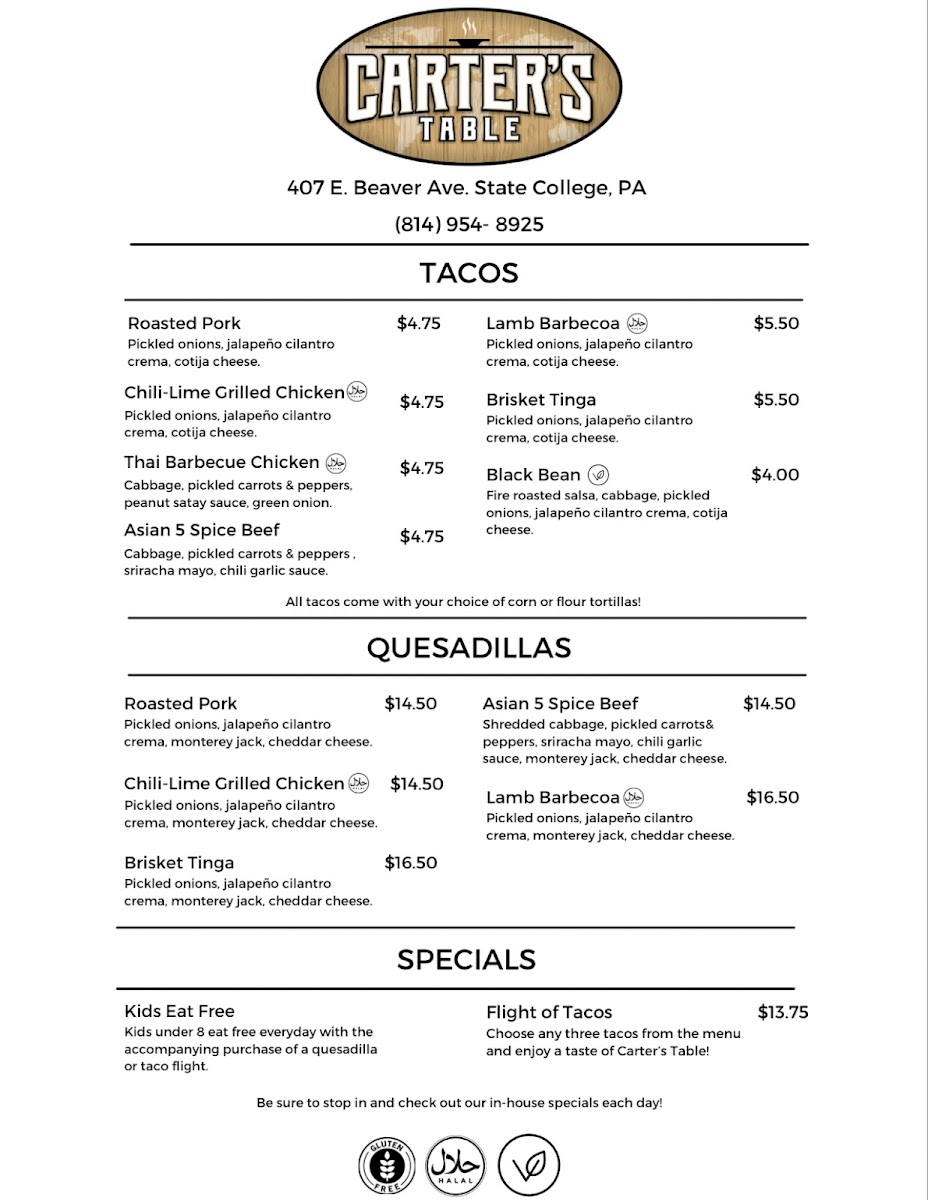 Welcome to Carter's Table - Restaurant, a delightful culinary haven located at 407 E Beaver Ave, State College. Known for their mouthwatering tacos and vibrant flavors, this venue is a must-visit for food enthusiasts.
